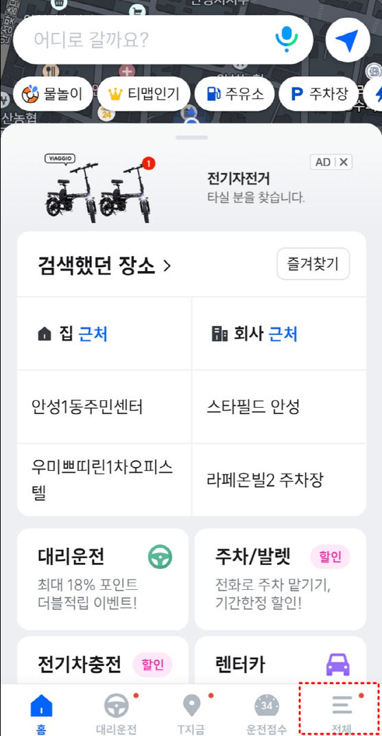 티맵 어플을 열어 우측 하단 '전체'를 눌러주세요.